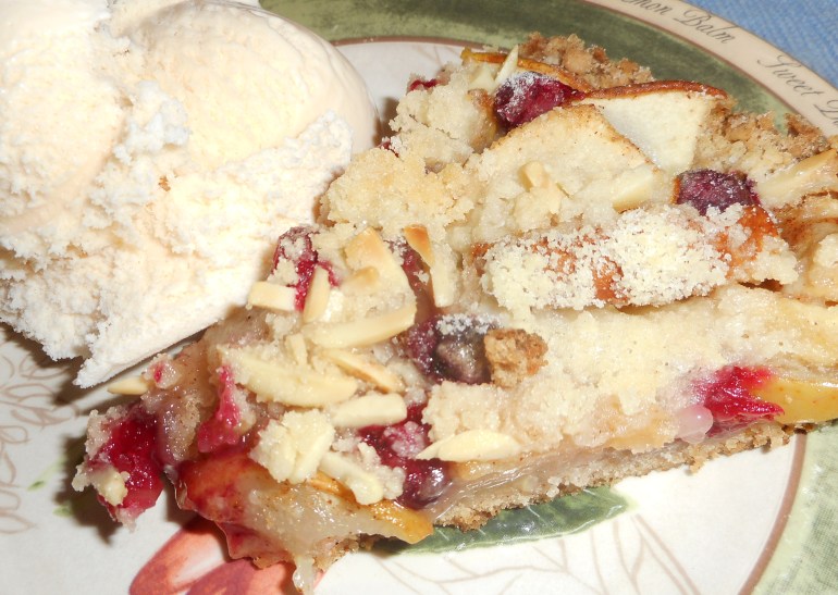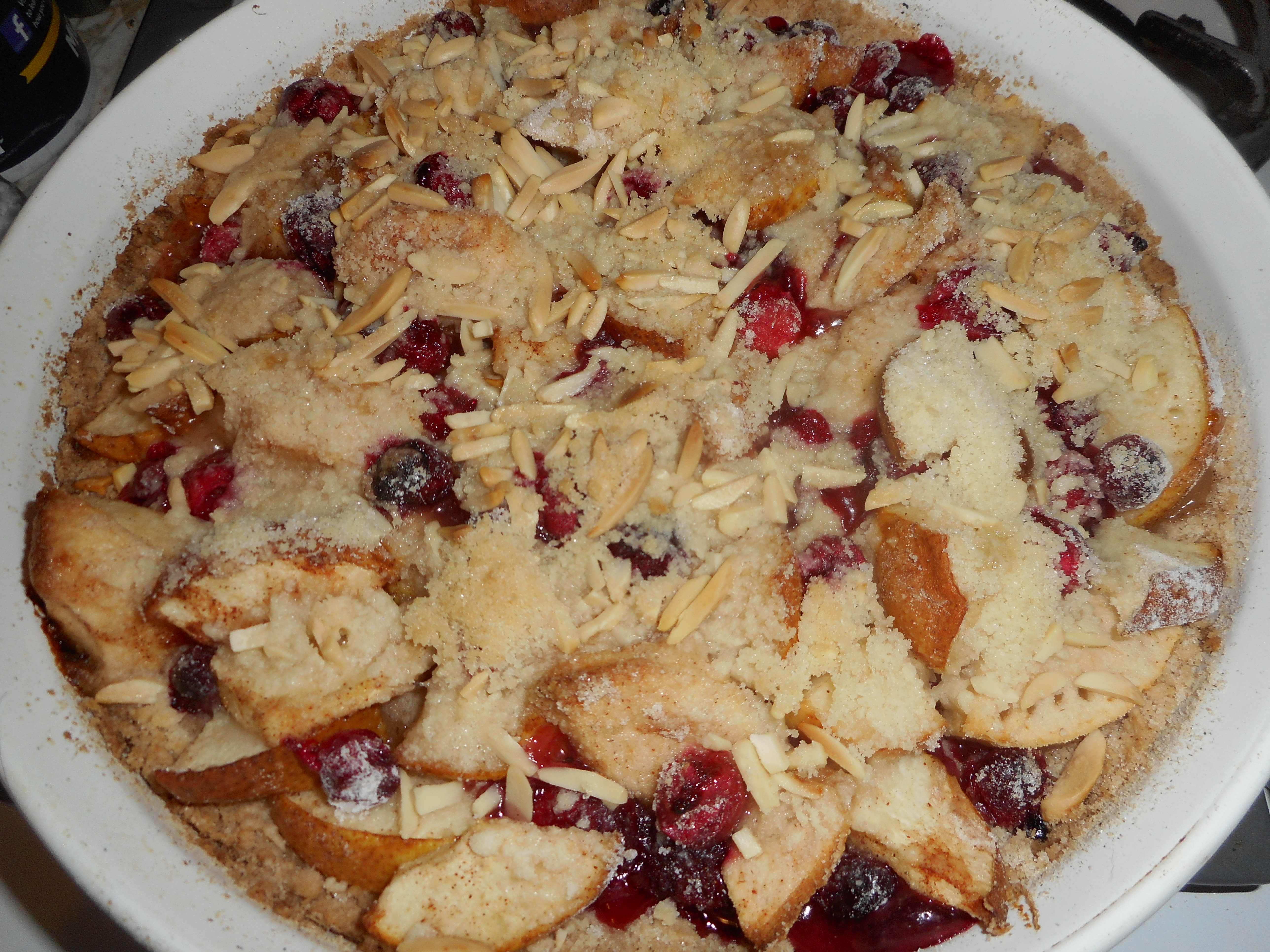 Well, this is my winter dessert Chopped blog post (Food Network show)…. I have some fresh cranberries, two almost ripe pears, one ripe apple, leftover crumb pie topping and slivered almonds. What to make? I didn’t have a recipe that suited those specific ingredients so I threw together this pretty tart with the three fruits for a filling and a very easy topping. Cranberries are good for you and they add a sparkling flavor to the apple/pear mix.