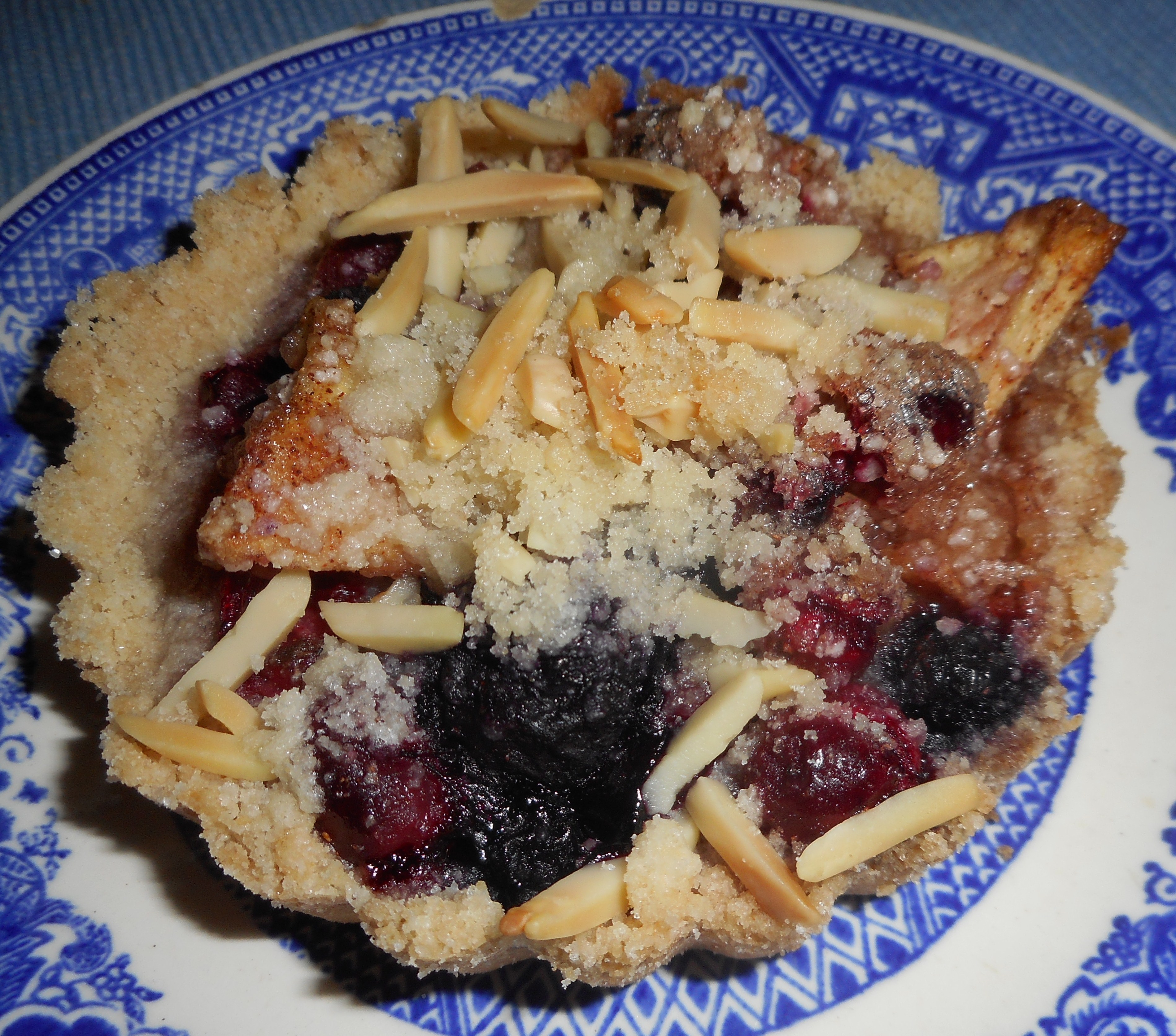 Pour into the crusted tartlet pans. Mound up a bit; it will sink when it is cooked. If you have any leftover fruit; you can bake it in an oven safe dish with crumbs on top. Sprinkle the tartlets with the almond crumb topping. I put the pans on a baking sheet for easy placement and removal from the oven. Pop the tartlets in the oven and bake 40-45 minutes or until bubbly and lightly browned. They take that long because the blueberries are frozen. Cool at least 10 minutes. Serve warm or cold. Enjoy!