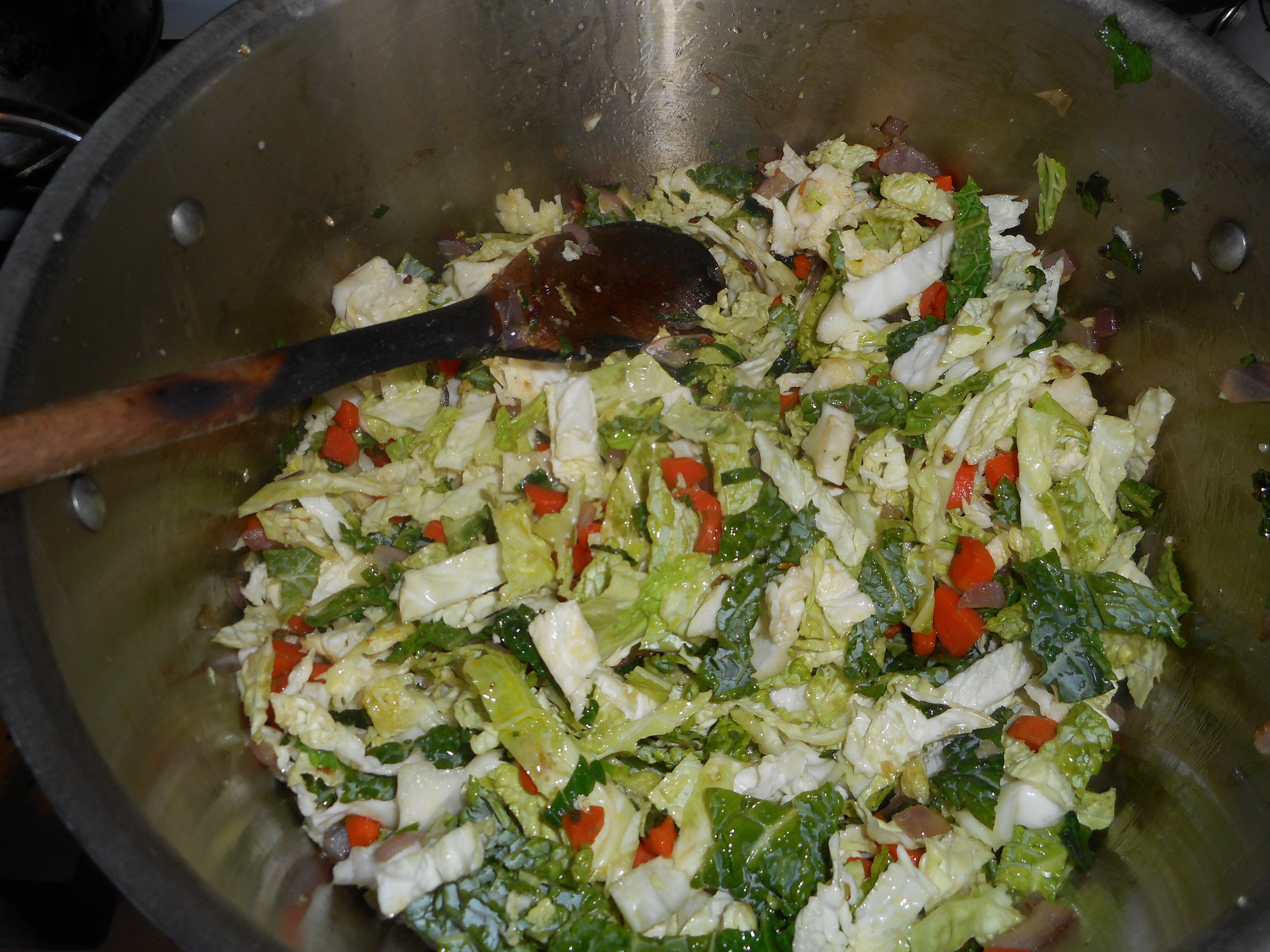 Sauté the onion and carrots in the olive oil in a big heavy bottomed soup pot. I use a heavy bottom as your soup will be less likely to burn. Cook 4-5 minutes, stirring occasionally. Add the sausage; push the onions to the pan’s walls so they don’t burn. Cook for 3-4 minutes on each side. Add the garlic as you are turning or stirring .