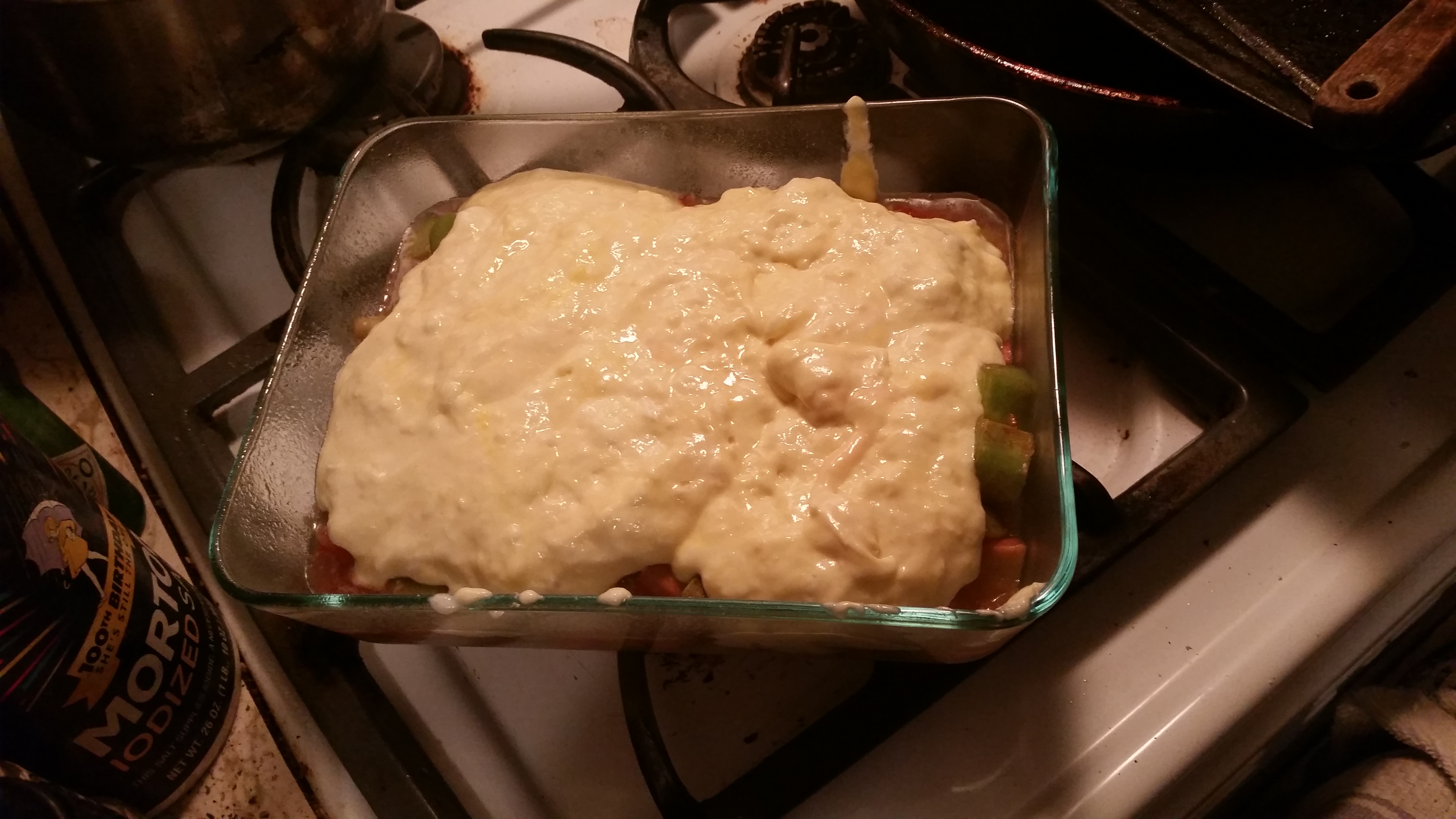 Mix the wet ingredients and then add to the dry mix in a big bowl. Mix briefly: do not over-mix for best texture. Use a big spoon to plop it right away on the hot fruit. Bake immediately as baking soda and powder can’t stand around waiting or they lose their umph!