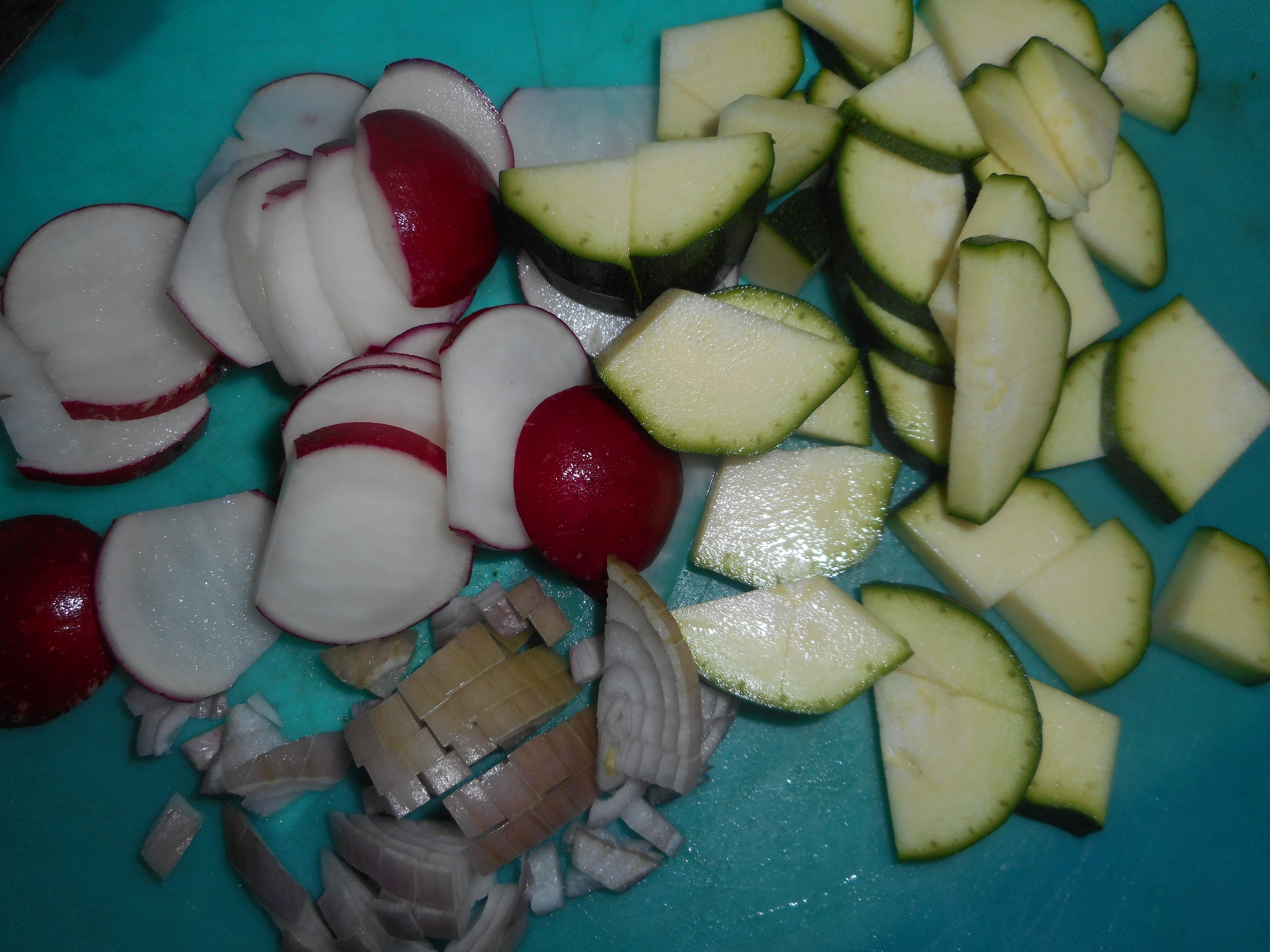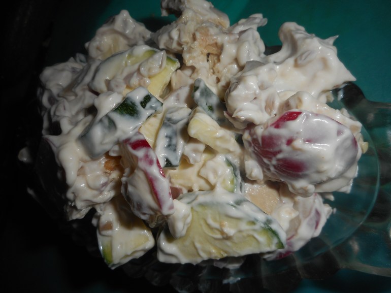 Chicken Salad Variation 2 – I used cherry radishes and raw zucchini but you could use any veggies you enjoy.