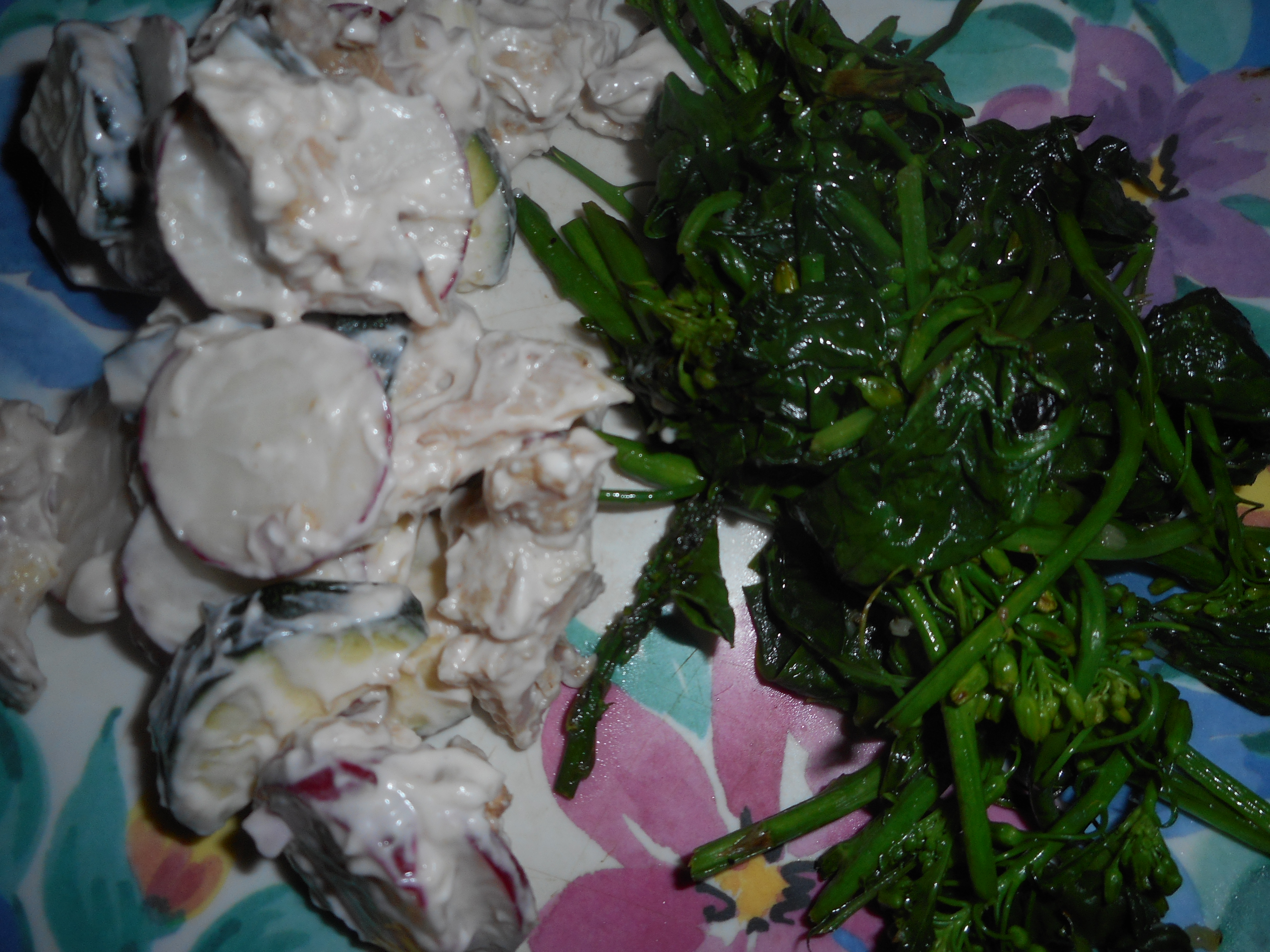 I like fruit, particularly grapes, in my chicken salad but I didn’t have much on hand so I went with what produce was in the fridge. I often have mine with lettuce, I am guessing it would be great on gf toast if sandwiches are your preference. This week I served sauteed spinach with asparagus as my side dish; no starch; makes all my low carbing friends extra happy.