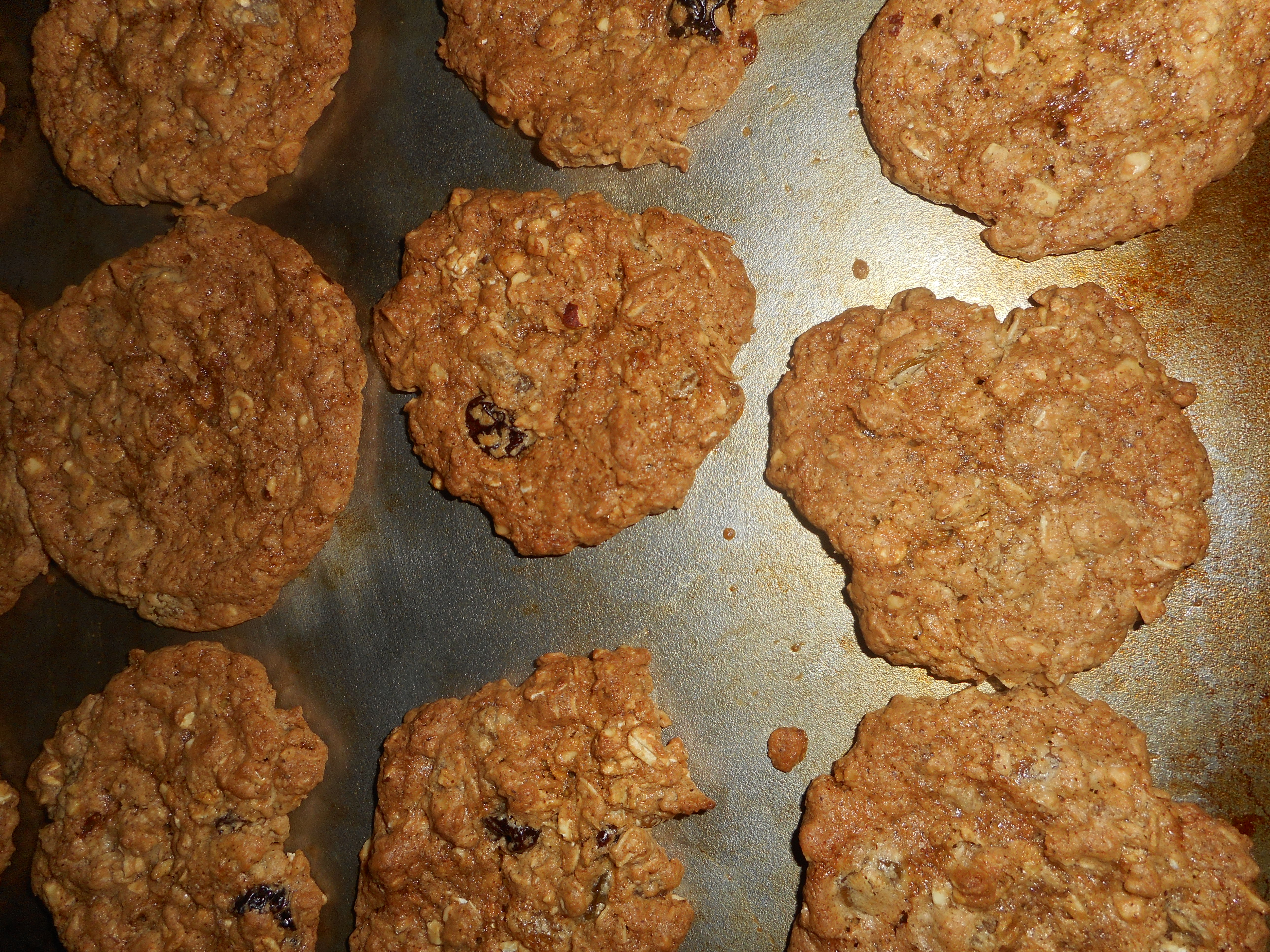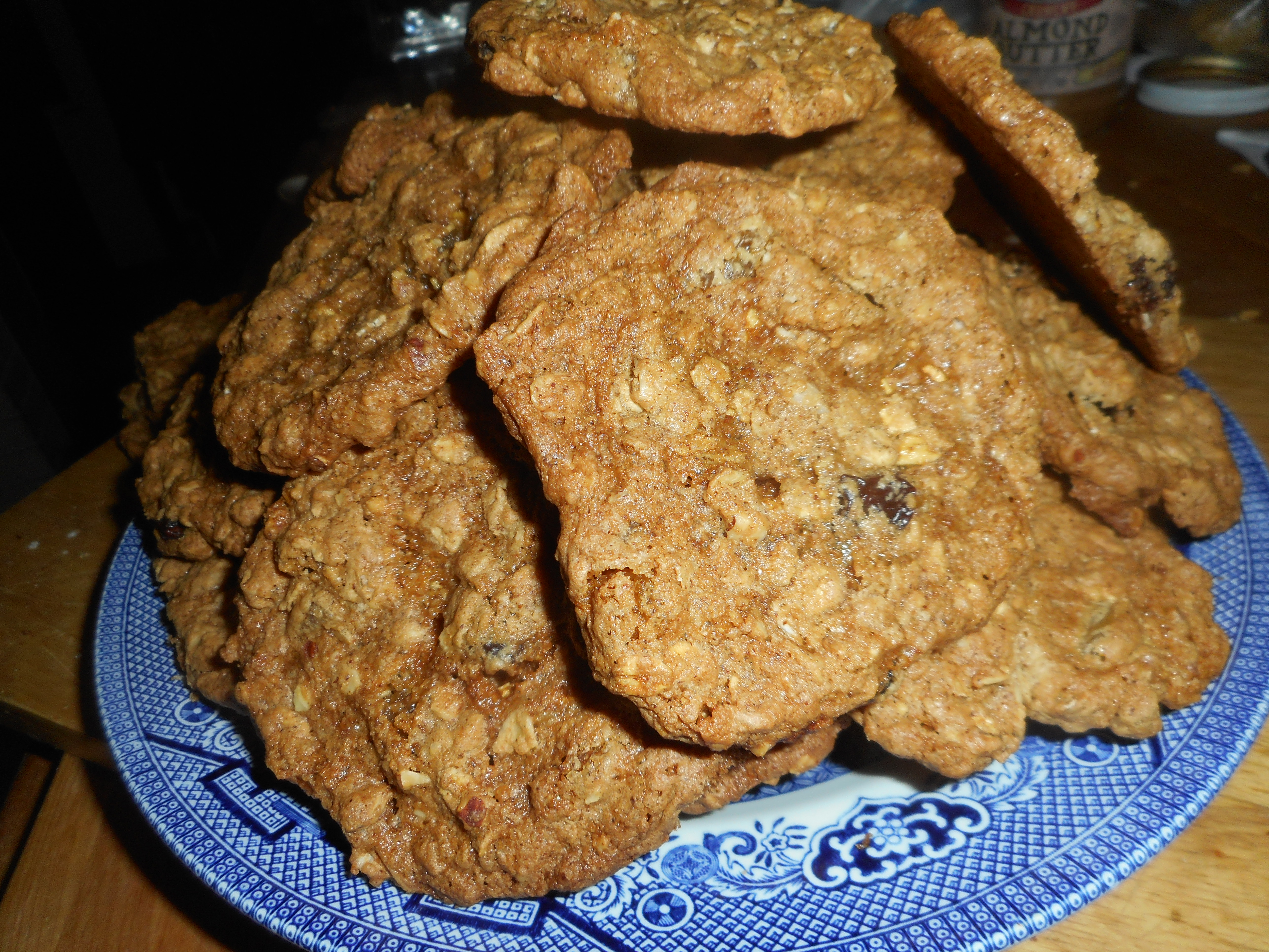 Heat oven to 350 degrees. Spray baking sheets with cooking spray. Drop glopping tablespoons of batter onto baking sheet. Bake 13 to 15 minutes. Don’t let them get too brown or burn! Let cool 2 minutes on sheet before removing with metal spatula turner to a cooling rack. Eat! I freeze most of them; they taste pretty good straight out of the freezer. Freezing tip for cookies; pair them smooth side to each other when placing in freezer bag; less likelihood of breaking. And you can get more into a gallon freezer bag that way.