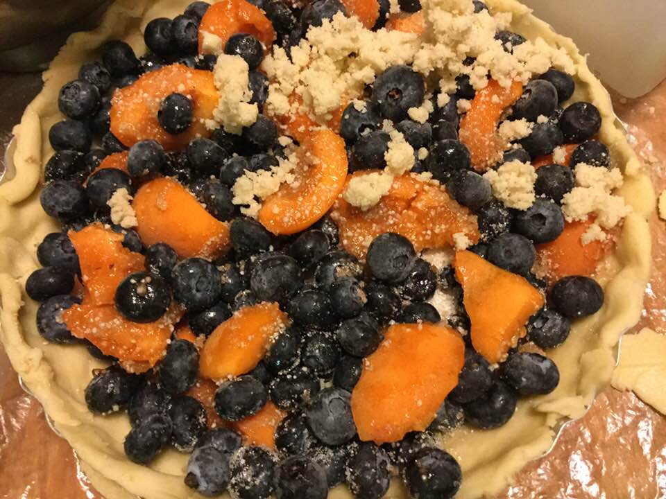 I bought a tray of fresh apricots and you may have noticed that blueberries are plentiful in every grocery store. Long long ago I made this delectable combination of fruits in a pie with a lattice crust when I could still eat gluten. So, this was a perfect pairing for adaptation to a gluten free pie recipe. The resulting pie was juicy and flavorful. We took it with us this past weekend on vacation
