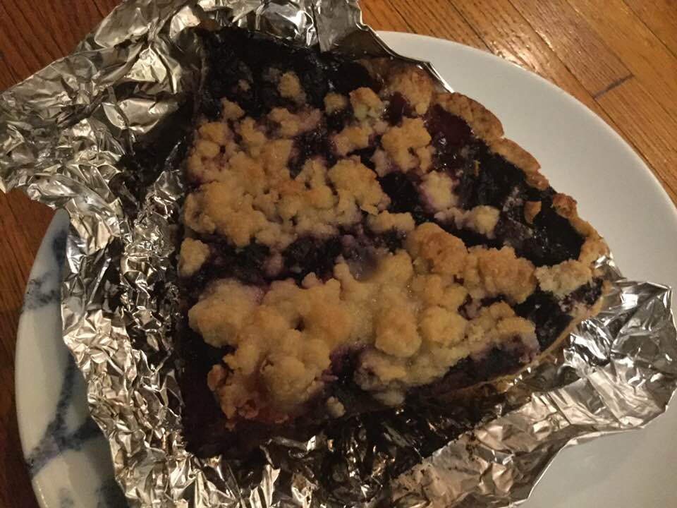 Bake in a preheated 400 degree oven for 45-55 minutes until bubbly and the crumb crust is light brown. You can put a pie juice catcher under the pie as it might bubble over. This protects the oven bottom from a mess. I put a piece of aluminum foil on top for the last ten minutes. Cool at least 2 to 4 hours before serving at room temperature. I think it is best served the same day you make it, or no more then 10 hours after baking for optimal flavor. The crumbs will get soggy if too much time passes. A way to remedy this is to grill your slices; see my recent posting on fire roasted pie!