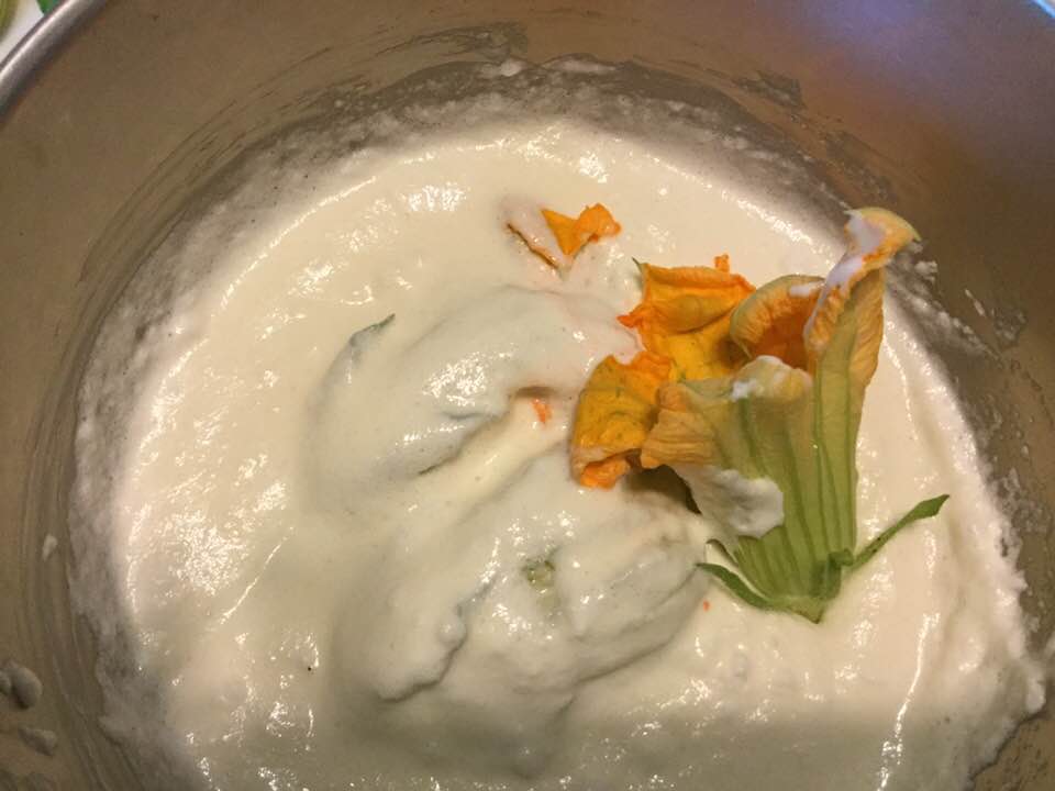 squash blossoms covered with batter
