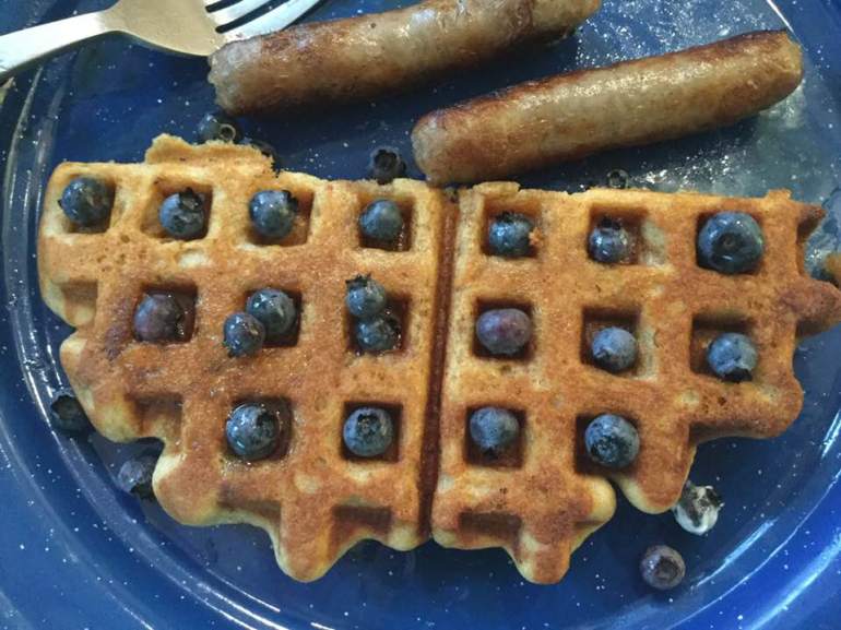 Directions: To make it portable; measure the dry ingredients into a zip-lock baggie. I like to write the other ingredients on with a black Sharpie marker and label it waffles…so you don’t use the pancake mix by mistake! Beat the egg in a large mixing bowl, add the oil, buttermilk and vanilla (optional when camping but I did bring it this summer and they were so yummy). Pour the dry mix into the bowl and whisk briefly until fairly well mixed.