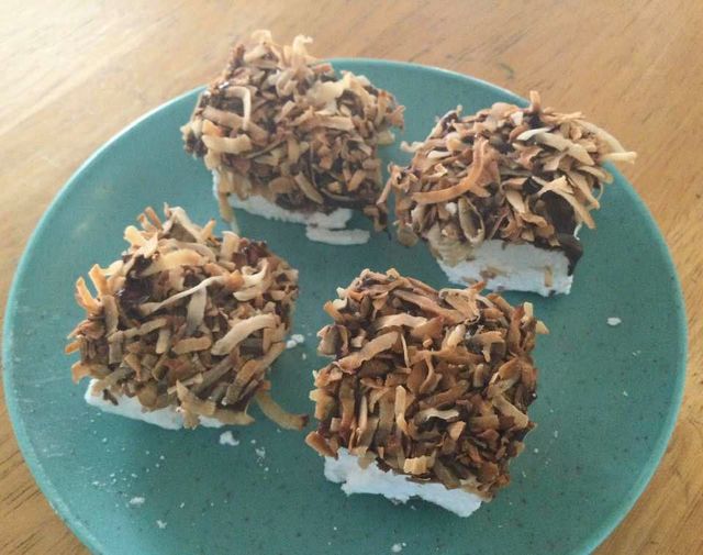 Dump out onto powdered cutting board (this is where lots of powdered sugar put in before helps it free from pan) and cut with dry pizza wheel into rows and cubes. If tool gets sticky wash in hot water and dry before cutting more. Dip some into melted chocolate. Then dip in plain or toasted coconut. Roll them in toasted coconut. Or powdered sugar. For kids try colored sprinkles.