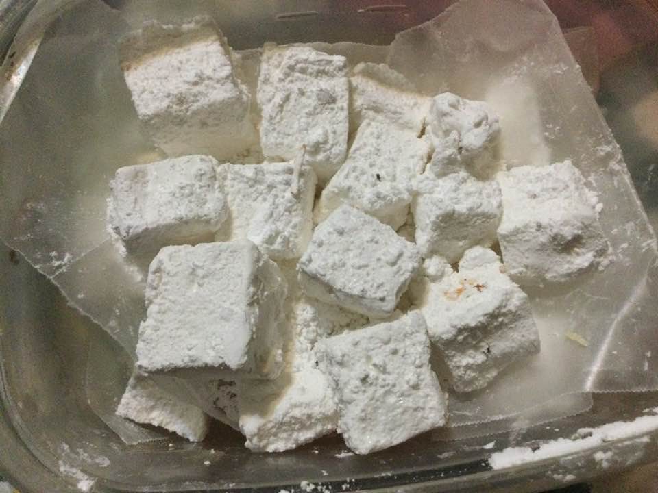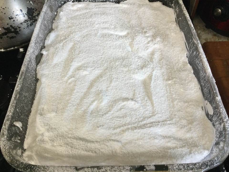 While it beats, put a decent amount of powdered sugar in 9×13 glass pan; very thick, thick sprinkle to well coat the entire inside of the pan is best. Maybe a ¼ inch thick. Pour hot sticky mixture into it. Smooth top with wet hands. Sprinkle with more powdered sugar. Let stand 8-12 hours. Longer is better.