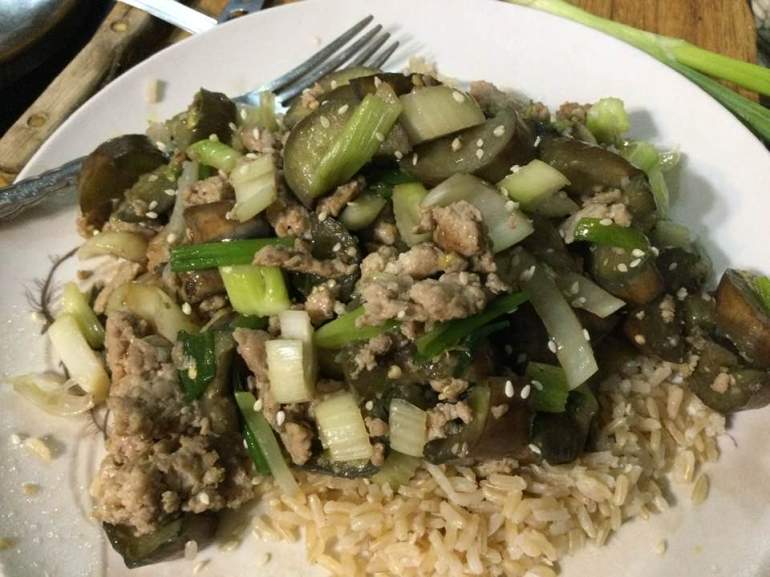 Notes; can change out zucchini and or cabbage, for green beans, carrots, pea pods…but you can’t change out the eggplant. Ground pork is excellent this way as well. Can use yellow onion rather than green if you prefer; cook a bit longer than scallions if you do. You could also serve this with rice noodles; the wide kind you let soak in boiling hot water for ten minutes; that’s all the cooking it needs.