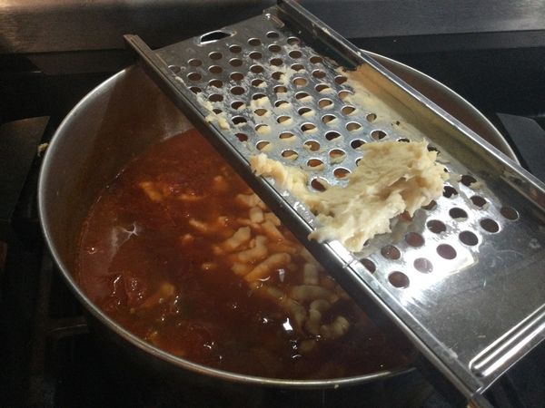 Summer always is tomato time around here. But it’s now officially autumn and this day is distinctly chilly. I still have a few nice tomatoes, so I made my homemade tomato soup but added something special to it. Spaetzle; skinny egg dumplings which my mom made free form and tossed in her tomato soup often served for Saturday lunch. I got a lovely spaetzle maker for Christmas which I had not used too much yet and so I decided that I would try to replicate my mom’s luncheon soup. You don’t have to make spaetzles, but I highly recommend them. They really shine in the soup’s rich flavor; they are delicate and delicious.