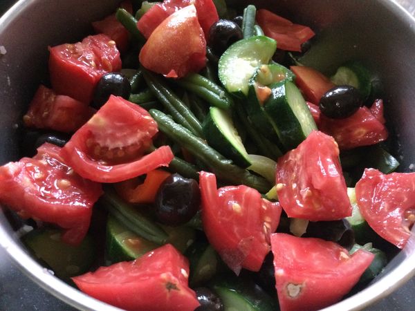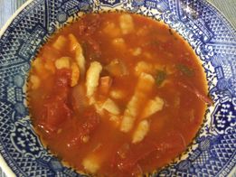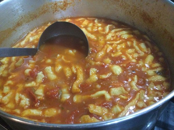 I generally make Ina Garten’s tomato soup recipe but simplified a tad. I made it today without the cream; I don’t think it goes as well with the spaetzles. So, if you don’t make spaetzles and don’t like it creamy leave out the cream or use half and half or whole milk for less calories. If you are a vegetarian use veggie broth instead of chicken broth. I actually did half of each type of broth today as I had nearly a cup of veggie broth to use up. You can strain or blend the soup. I never strain but sometimes I use my immersion blender to make it smoother. But I generally prefer it unstrained and chunky. Note: It has a good amount of garlic which you can reduce as wished. I cut back on the salt, but you can cut it even further as you wish.