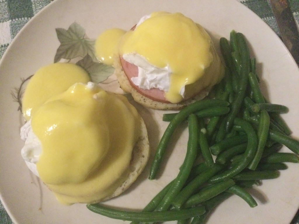 Assembly: place two hot muffin halves on each plate. Top with a slice of Canadian bacon and then a poached egg. Pour a big dollop of sauce on top. We like them served with briefly steamed asparagus spears in the spring and either green beans or steamed broccoli spears the rest of the year. Dig in!