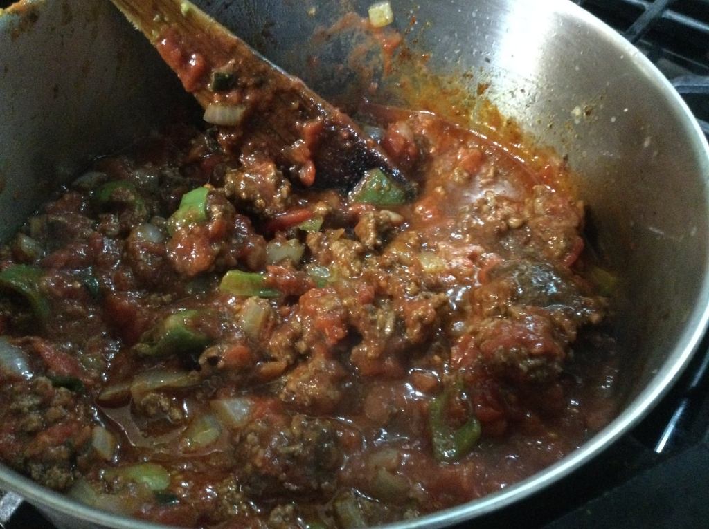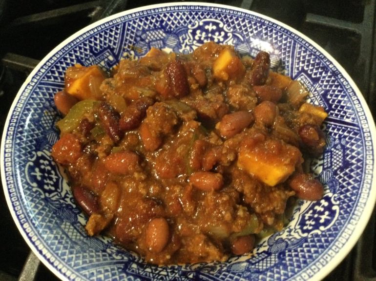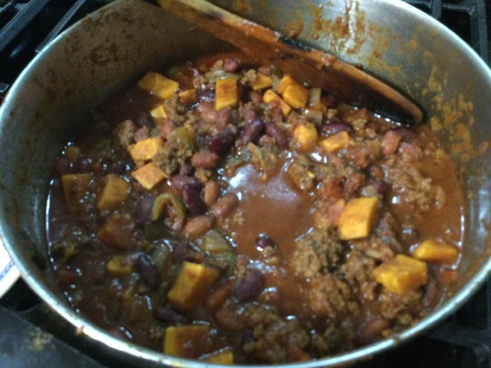 Spray la arge wide 4 qt. pot with cooking spray, heat and add ground meat. Let brown as you break it up and spread out the meat. After turning it once add the onions. Cook, stirring a lot, until meat isn’t pink. Add minced garlic; stir in, cook 30 seconds. Add all spices, stir well; cook a minute. Add wine, stir, Add crushed tomatoes. Use cup of water to rinse tomato can and add all to pot. Add diced yams and Worcestershire sauce. Cover and simmer on low at least 30 minutes; I cooked mine for more like an hour. I stirred it a lot, at least every 10 minutes taking care to scrape the bottom, so nothing is sticking. I had to go out so I shut it off, put the lid on and restarted it when I returned. It’s flexible that way. Then add kosher salt to taste; I put in 1 tsp. Add the beans. Stir in carefully and cook 15-25 more minutes. Taste and adjust salt, add more ground black pepper if wanted. Honestly it is even better after a good rest in the fridge; the flavors will blend further. So good with corn bread. I didn’t add any toppings; it was just right without any additions, but you can go to town with scallions, grated cheese, or whatever you like. Enjoy!