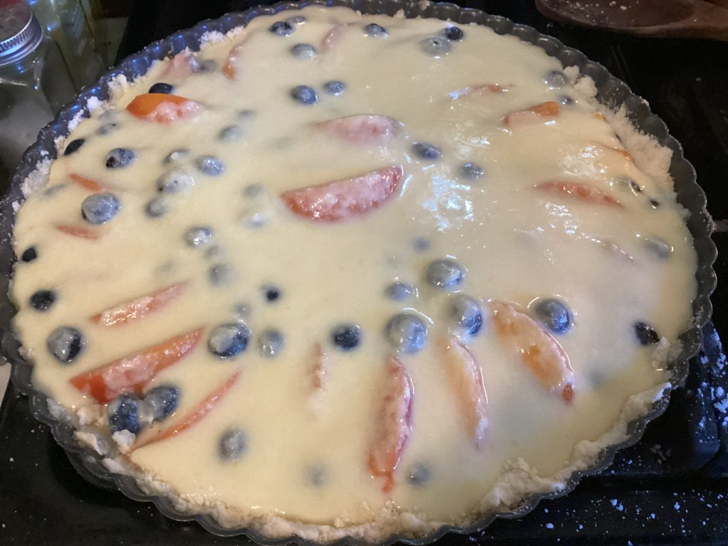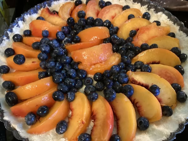 Mix ricotta with eggs in the mixer bowl you just made the crust in and then add the rest of ingredients except the peaches and blueberries. Lay the fruit in the crust. Scatter or arrange as you desire. Carefully pour into the tart crust.