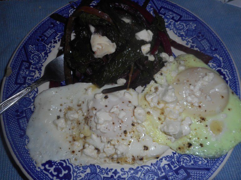Sprinkle with good quality salt and freshly ground pepper and you have an inexpensive, tasty and healthy protein. Eggs were out of favor for a long while but I never gave up on them. My dad always said they were good for you and that the lecithin in them counteracted the rich yolks. Now experts say they are okay to eat within moderation. Go figure! Regardless, I do love them for a quick satisfying meal at a low cost and they match perfectly with the earthy flavor of beet greens. Don’t forget a touch of butter and the salt/pepper; this dish really needs it to brighten the greens. Enjoy!