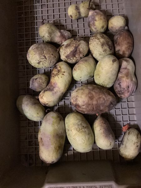 This is all about a flavor sensation: pawpaw. They are the only native to America tropical fruit. Looks like a small funky green mango. tastes like a banana and a mango had a baby but with a touch of wild toasted coconut flavor. Squishy soft yellow flesh with dark brown seeds embedded in its flesh. Its skin can look pretty mangy but when you peel the skin off the insides are ripe and perfect for eating. They are not sold commercially as their season is very short and they are a delicate fruit that doesn’t travel well. They grow in the wild in the woods in the mid-Atlantic states, but I know someone with 2 trees, and they share with me. The first few times I ate it I was not sure I liked it; too weird a flavor. I persevered at eating a few and grew to find them interesting eaten fresh. Eventually I fell completely in love with these squishy treats.