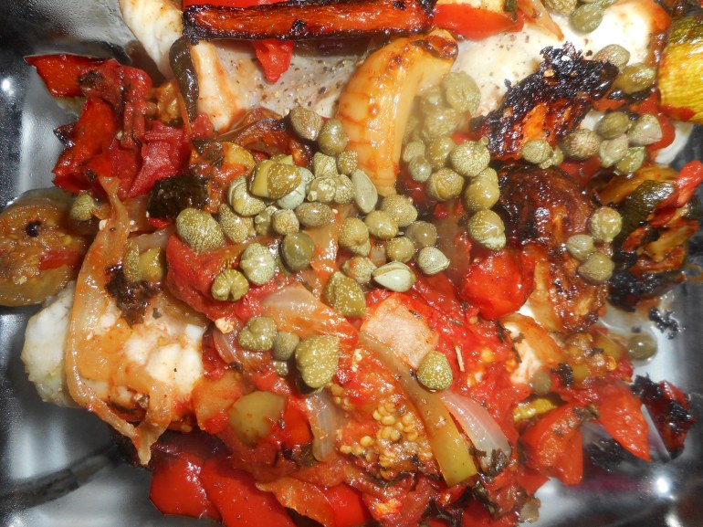 Sprinkle with white wine, garlic and tomatoes. Cover loosely with foil and roast 5-10 minutes more. Remove pan from oven. Stir in basil. Lay fish fillets in the middle of the veggies; push them aside first to make a cleared space; drizzle with remaining teaspoon oil; season with salt and pepper. Cook about 10-12 minutes. Sprinkle with capers and fresh basil if you have some.