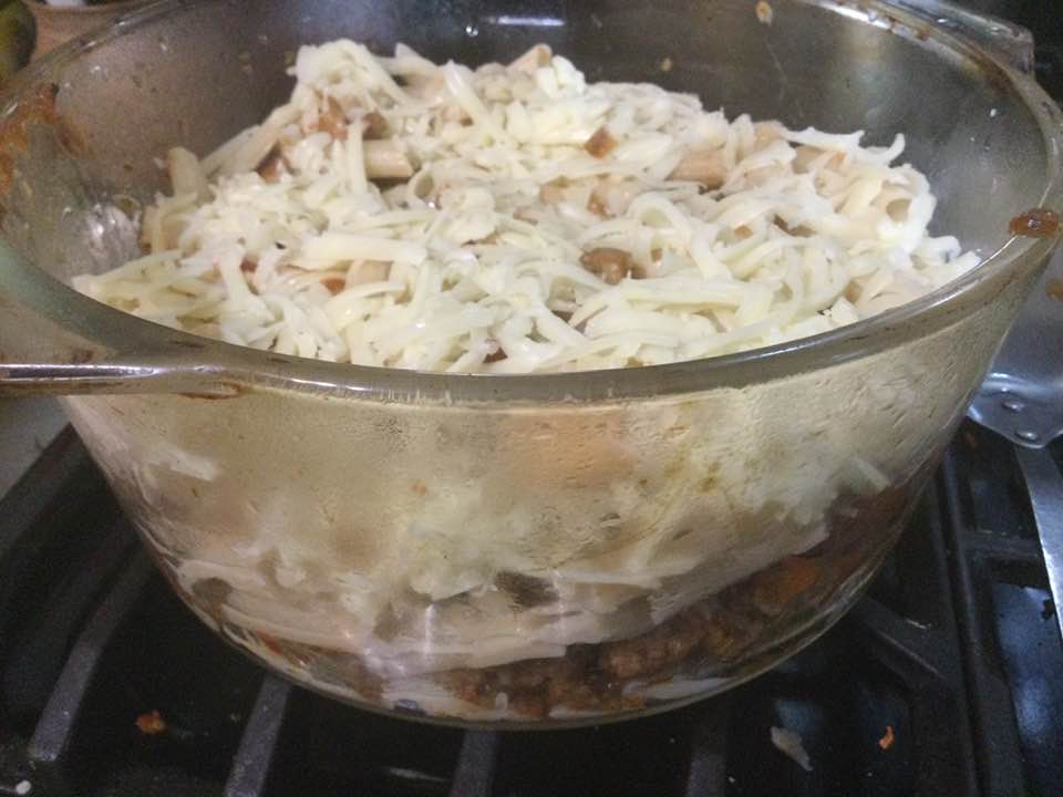 This is the inside of the casserole as I build it up; just added fried onions on top of ricotta cheese mixture which is on top of pasta and sauce. Rough layers, sort of like lasagna.