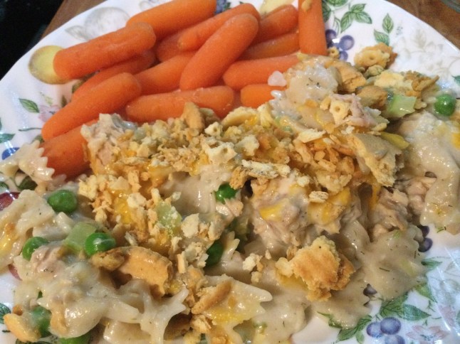 I just made the classic tuna casserole but without the canned soup goop. Instead, I made a scratch white sauce flavored with sautéed onions, celery, garlic and peas plus a hint of dill week. Mixed with the par cooked pasta and 2 cans of drained solid white tuna it was somewhat sad looking. I topped it with partially crushed Shaar Company crackers, like Ritz crackers but gf. then I drizzled melted butter over the crackers and baked it for 25 minutes. It became all crunchy buttery crumbs that elevated my delicate white sauced tuna into a delicious treat. I don’t actually remember when I last made a gf tuna noodle casserole. That’s because so often it is a goopy dull mess of that canned sauce and sad noodles. this is just an elegant and tasty version I know I will make it again and again. One cavoite; I think I will cook the noodles less so they are definitely underdone before assembling the casserole. Mine were a tad overcooked when reheated the next day so undercooking is the way to go.