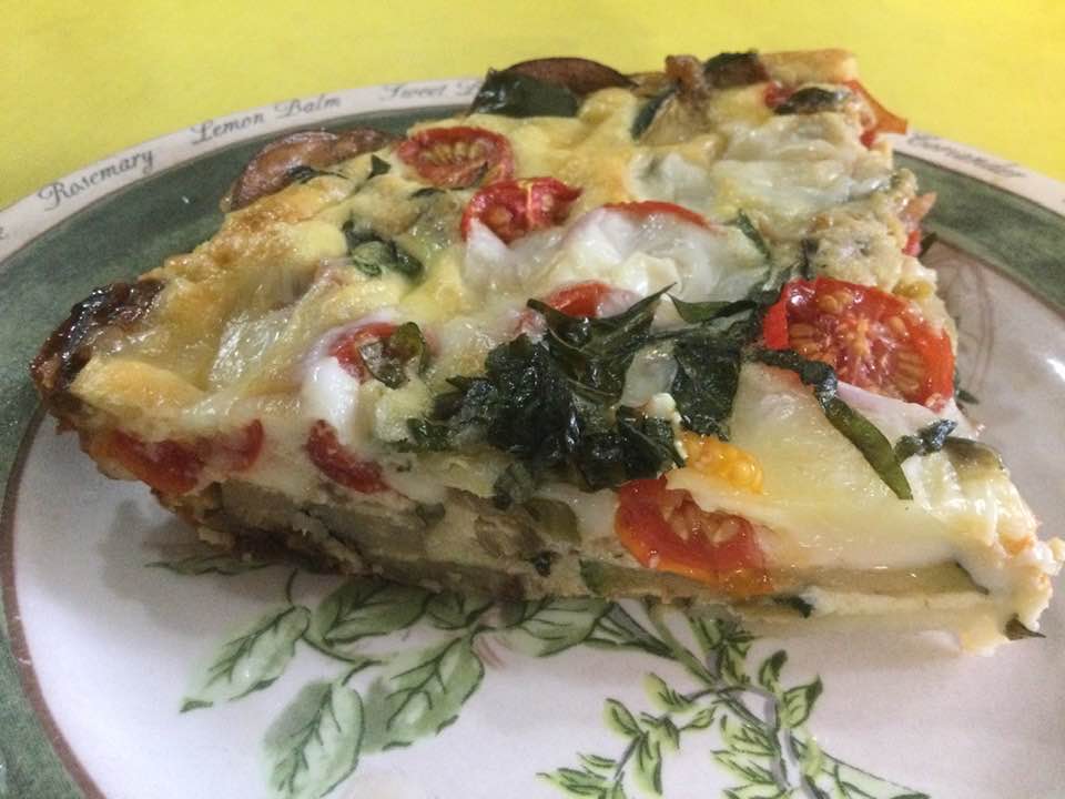 Sometimes you just don’t feel like making a traditional crust. This was one of those times. I had a homegrown zucchini, some cherry tomatoes, cheese, eggs, and 2 potatoes. Quiche for supper! This is a different filling recipe than my usual one; it is more eggs, half and half instead of milk and no cottage cheese; cubed mozzarella cheese. It was a delicious change of pace especially with the julienned fresh basil leaves sprinkled all over the top. You could use other veggies; I went with what I had. The garden’s bounty and it didn’t fail me.