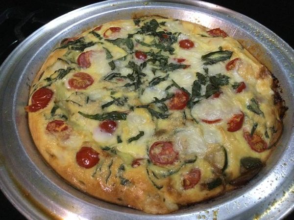 Sautee the onion rings in some EVOL; maybe 2 tsp of it. Add squash after 2-3 minutes. Cook until softening; maybe 5 minutes. Sprinkle with garlic powder. Pour into warm potato crust. Sprinkle with tomato halves and cheese cubes. Pour egg mixture gently over it Sprinkle with basil leaves.