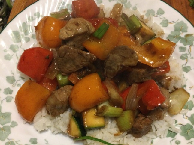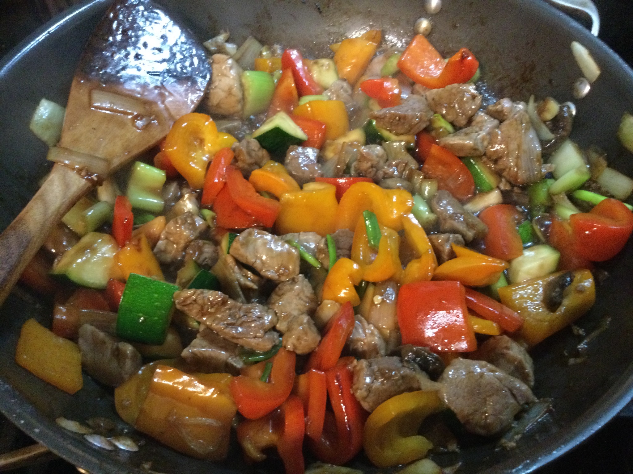 Directions: Cut meat into 3/4-inch chunks, cutting off any big globs of fat. Sprinkle with some meat tenderizer if you like to do that. I did. Heat oil in a wok or wide fry pan; I used a large non-stick paella dish; it kind of worked well. Add the meat. Cook 2-3 minutes, stir up to get a new side down to browna little, cook 2 more minutes, stir again and cook another 2 minutes. You want it to reach 146-150 degrees; I actually tested the biggest chunk with my instant read thermometer. Remove meat from pan. Add the peppers, onions and celery. Cook 3 minutes, stirring often. Add zucchini and mushrooms. Cook 2 more minutes. Add scallions and cook a minute. Add garlic and the sauce. Cook about 2 minutes until sauce thickened. I added 1-3 more Tbsp. water as it got too thick and I didn’t want it to burn or for the garlic to taste raw. Maybe next time I will cook the garlic a minute with the veggies in the pan before I add the sauce. Up to you just don’t overcook those veggies; they should be slightly crispy. Serve over hot rice. Enjoy!