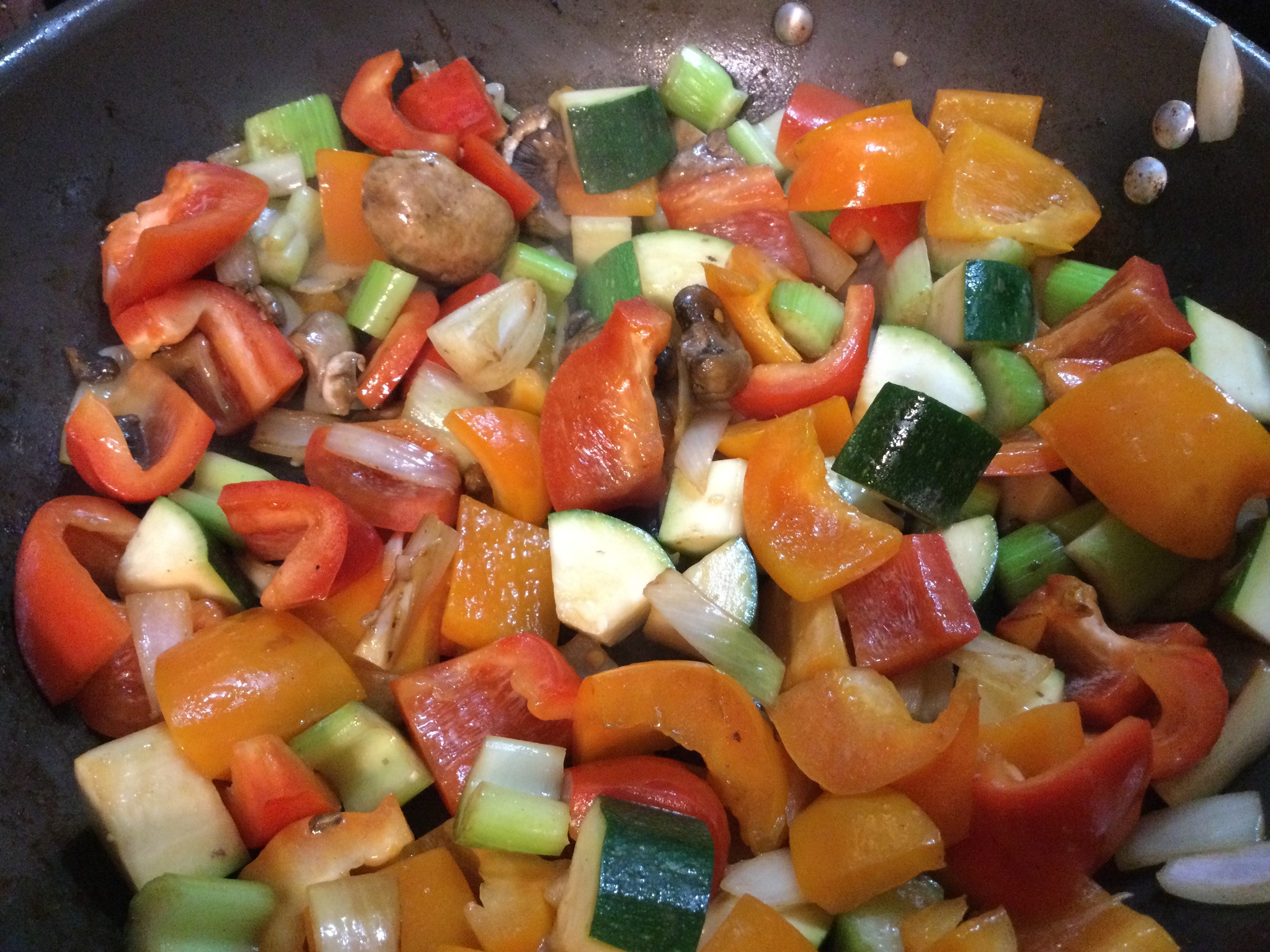 You should definitely use bell peppers, but the other veggie choices are flexible. I like onion and celery in mine. Had mushrooms and a zucchini to use up so they went in too. Snap r snow peas would be excellent instead of the zucchini. I served this over some leftover jasmine rice; perfect but brown rice or rice noodles are great alternative starch options. If you are keto; skip that starch!