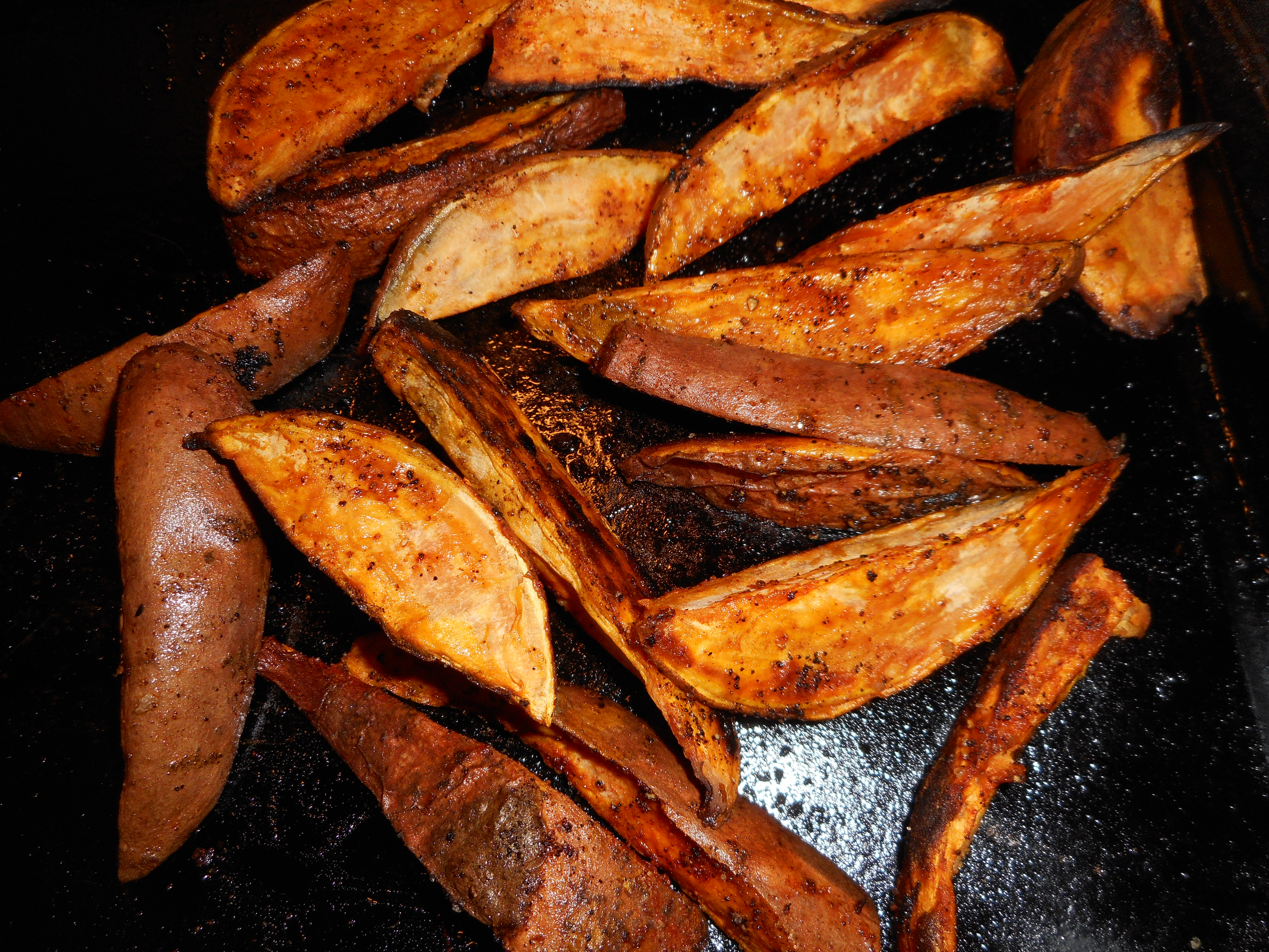 3-4 yams, wash, dry and then cut up into long fairly narrow wedges; 6 to 10 per yam depending on size and place them on a cookie sheet with edges, mound them up in the center