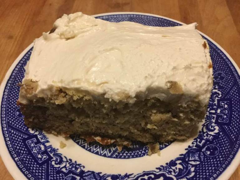 I made the cream cheese icing in the original busy bee recipe, but I doubled the vanilla (the amount below is the doubled amount) as I like it with more of that delicious stuff! It was a big hit and really finishes off the flavor of the cake. This is made in a nine inch square cake pan. I did put my cake strips around it as it was browning unevenly. They helped to even the baking out.The bake temp is 350 degrees for 35 minutes. If you have no eggs you could do the flax eggs (2 Tbsp. ground flaxseed and 5 Tbsp. water; mix and let sit 5 minutes) or do 1/3 cup unsweetened applesauce. In these pricy egg days these two alternatives become very attractive!