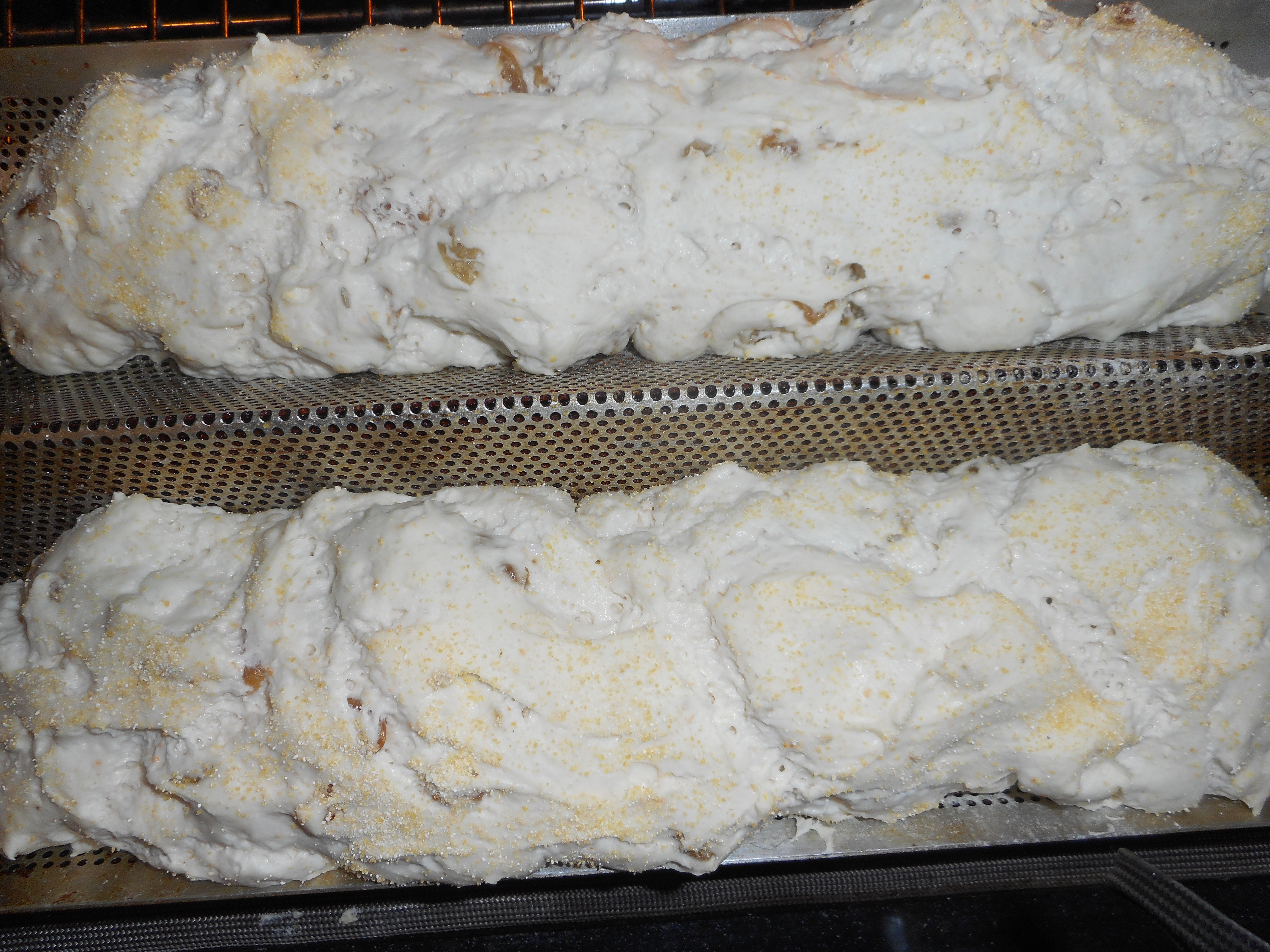 Add these three things: 75 gms tapioca flour, 1 tbsp. sugar and 1 tbsp apple cider vinegar, Blend well with the stand beater. Turn out onto lightly floured bread board, form into a log; I like to roll it back and forth to smooth the bumpy surface. Place in a metal baking loaf pan sprayed with gf cooking spray. Cover with the damp cloth and put back in the warm place for 60-90 minutes. It should have risen some but doubtful it will double. I like it to be puffy but not too puffy or it might become over risen, not good!