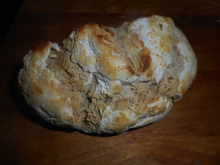 There is no tricky kneading or shaping of this bread. I roll it into a tube shape and bake in a metal loaf pan so I have the traditional bread shape for use in sandwiches. This bread made great grilled cheese or panini sandwiches. I slice up the loaf the day after baking it and freeze it in a freezer Ziplock; defrost in microwave for 50-60 seconds and you are ready to toast it or make a grilled sandwich! You can make it in a round or oval boule if that floats your boat; you might want to use a banneton to shape it as it rises and a cast-iron Dutch oven to bake it in. I generally like the boule recipe on Bakerita.com for that sort of sourdough but this recipe below could be shaped, risen in a mold called a banneton and baked in a boule. My Dutch oven is oval, so I tend to make oval loafs in it; they slice in nice slices which are mostly the same size.