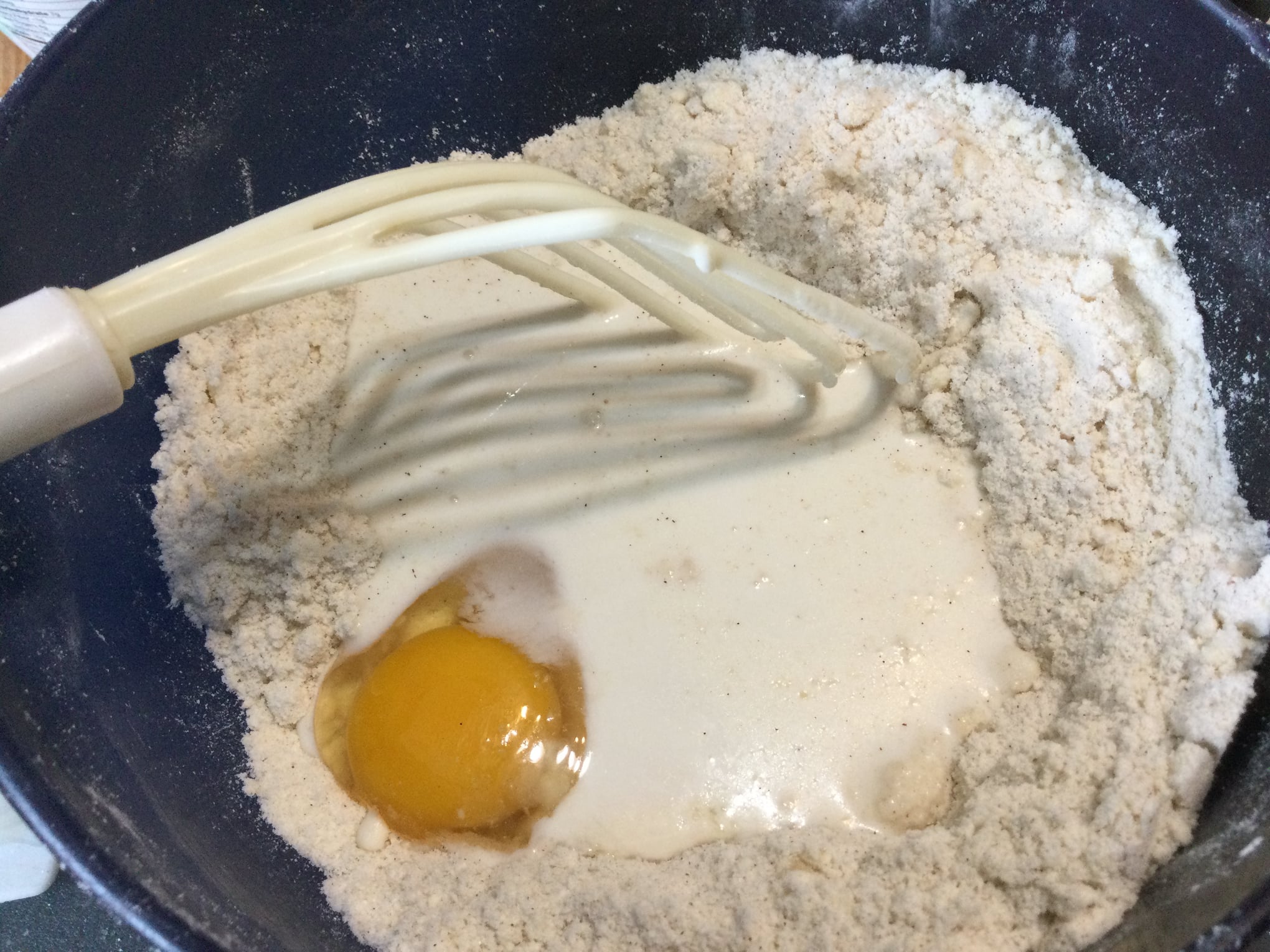 I mixed it with a spoon and then dumped it out; seemed dryish but as I gently kneaded it the dough became more fully blended, and the dry flour mix disappeared. Trust me, it is easy to make and utterly decadent despite no fancy sweet icing.
