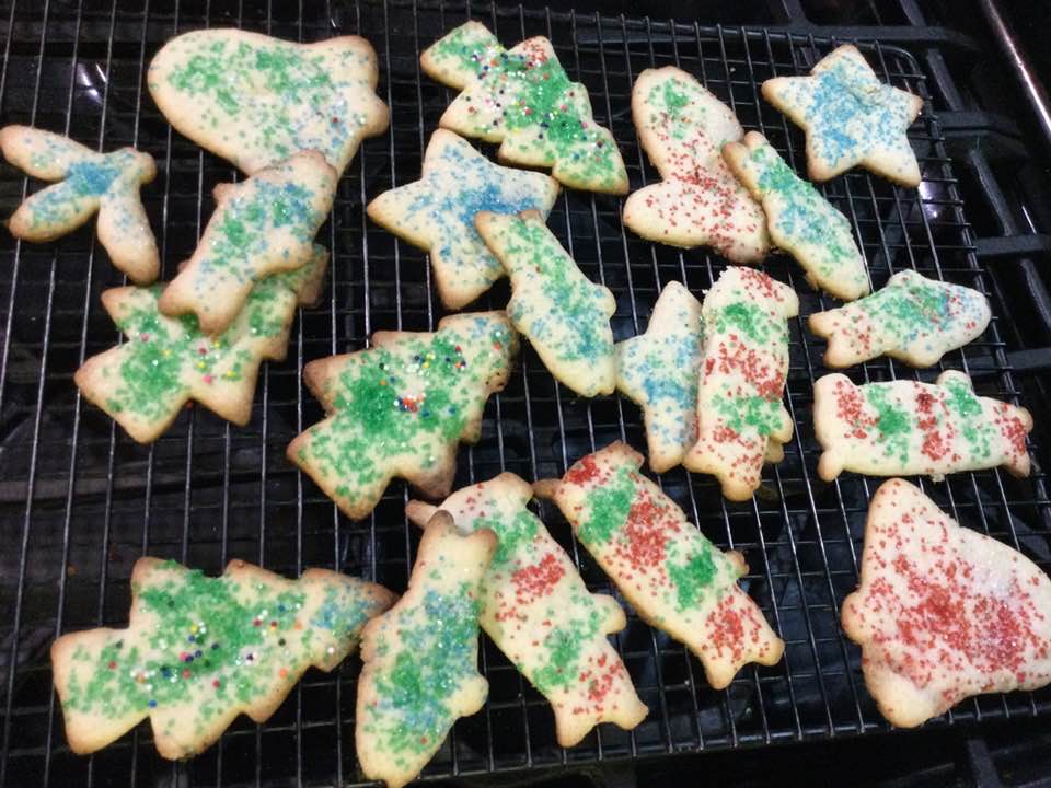 As you are cutting them out get the oven ready. Put oven shelves on two middle racks. Heat oven to 380 degrees (the 400 degrees of the original recipe seems too hot). Leave 1 to 1.5 inches between cookies. Bake 6-9 inches. I like to put all the small cutouts on one sheet and the bigger ones on its own baking sheet as the small ones will bake a bit faster. Watch them closely; the outer cookies bake faster and smaller ones faster too. Pull out when the edges are a light brown. let stand on sheet for 3-5 minutes. Gently move each cookie to a cooling rack using that flat metal spatula. Best consumed when they are fully cooled; warm they don’t have the correct texture.
