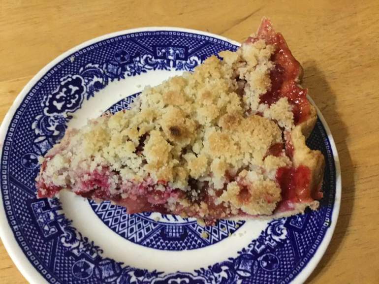 Pour cooled filling into pie shell, top with crumbs; use them all; sprinkle with your fingers. Top with a Tbsp big crystal sugar if you have any – a nice finishing touch.