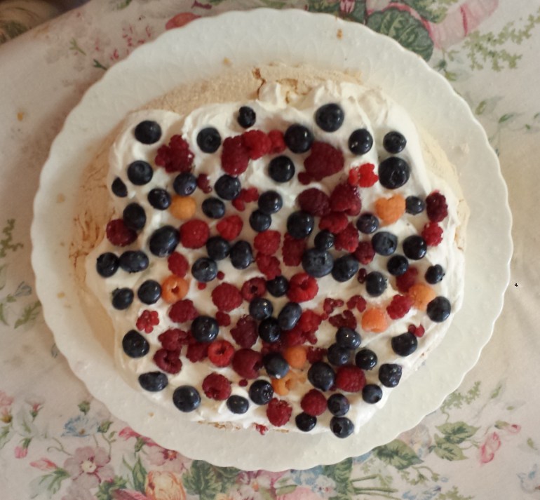 My sister got the classic pavlova recipe from Food network – a 1999 recipe. It is naturally GF so no one will ask where the wheat is! Don’t leave out the red wine vinegar; totally necessary. I confess I have forgotten the vanilla this time and noticed nothing wrong. I used brown sugar this time slightly more rustic look but great flavor. Use what ever sugar you like.