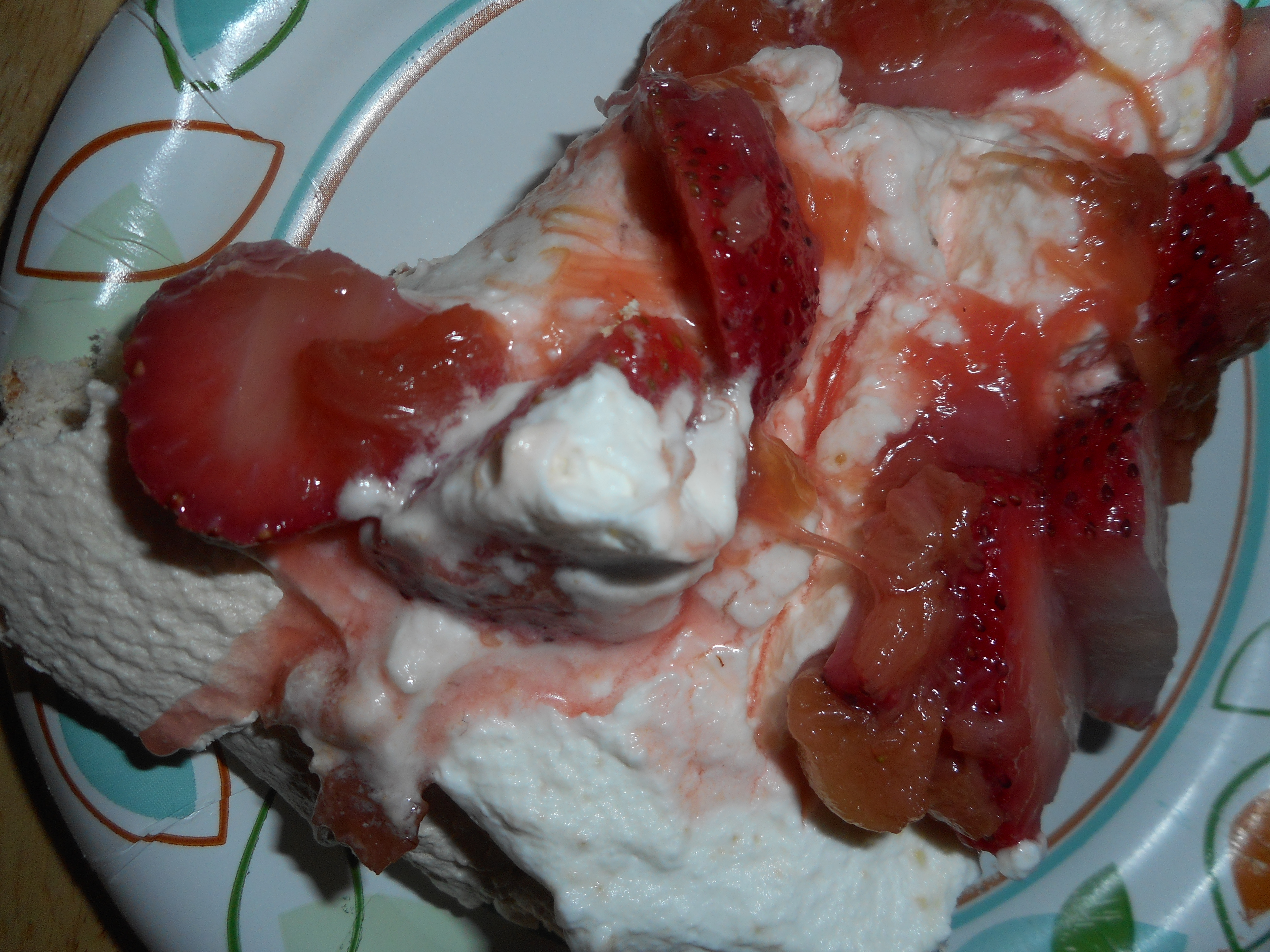 Whip the cream and brown sugar (or white sugar) and almond extract until stiff. Spoon it on top of the center of the fully cooled pavlova and spread out to within 1/2 inch of the edge, spoon on the rhubarb and strawberries, I used a slotted spoon so I could control how much syrup goes on the cake. To serve, slice into wedges with a serrated knife. Serve extra syrup on the side.