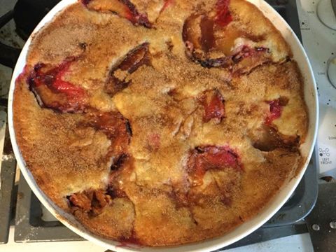 Beat eggs in medium bowl, add rest of wet ingredients, mix well, add to dry ingredients, stir the batter briefly to fully blend. Pour into the prepared pan and spread it out with a flexible spatula. It often just spread great if you tilt the pan a bit – the batter will spread all on its own. Top with plums, cut side up, push each in slightly into the batter and cover the entire surface of tart base. Sometimes I cut up a few plums and fit the chunks in around the halves but this time I didn’t; works either way.